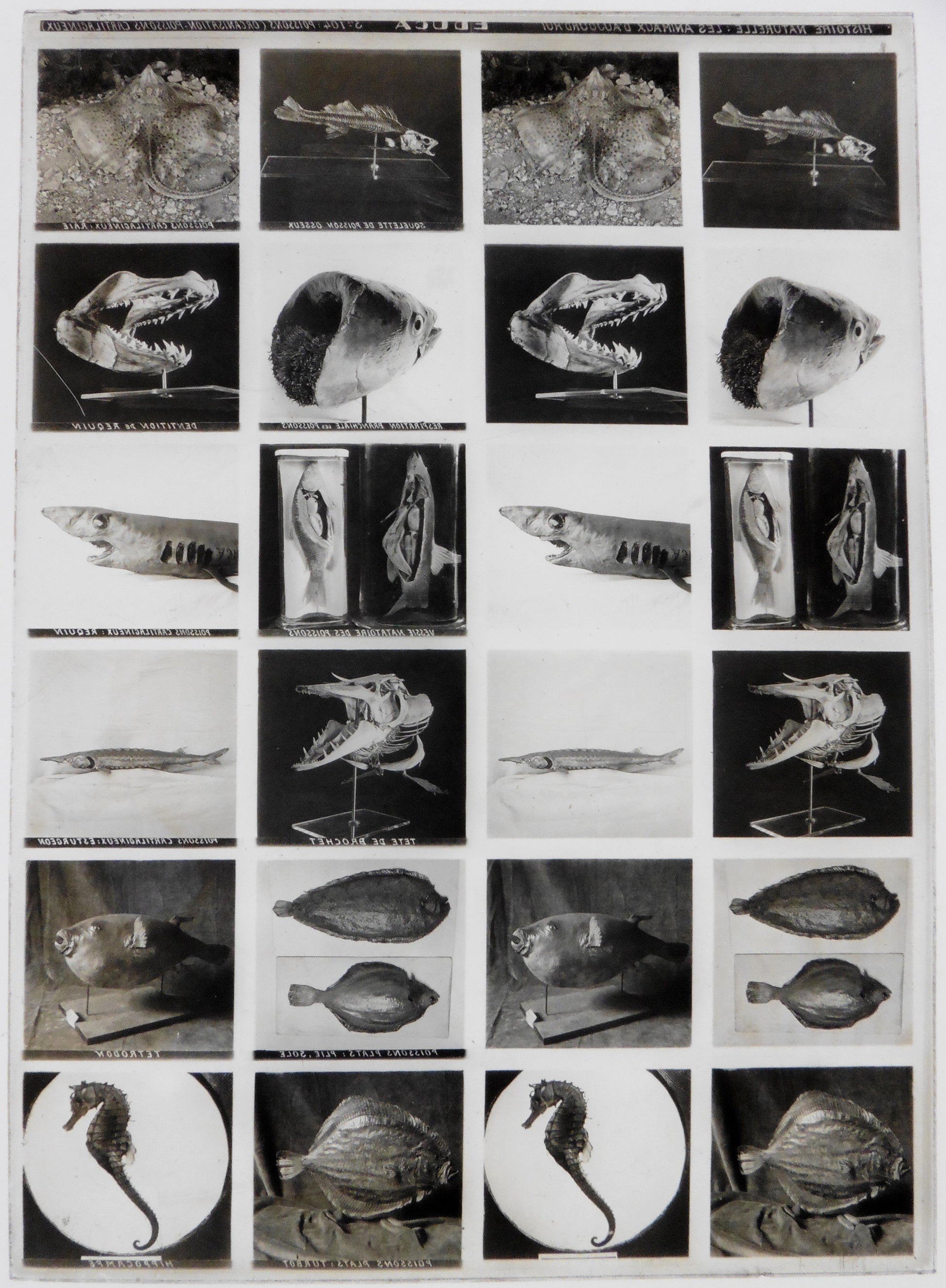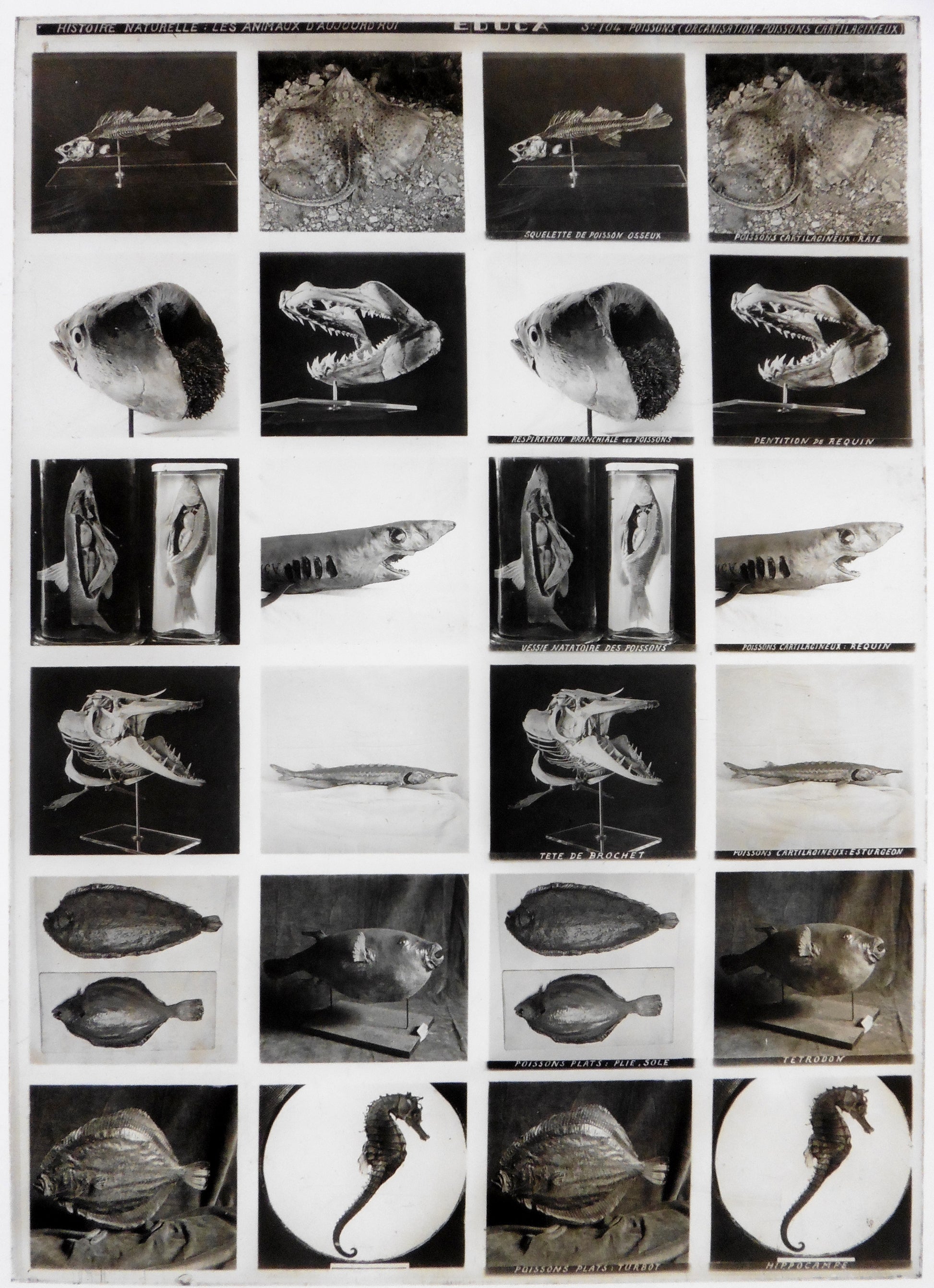 (Squelette de poisson osseux, poissons cartilagineux: raie, requin, esturgeon. Respiration branchiale des poissons, dentition du requin, vessie natatoire des poissons, tête de brochet, poissons plats: plie, sole, turbo. Tetrodon, Hippocampe...)