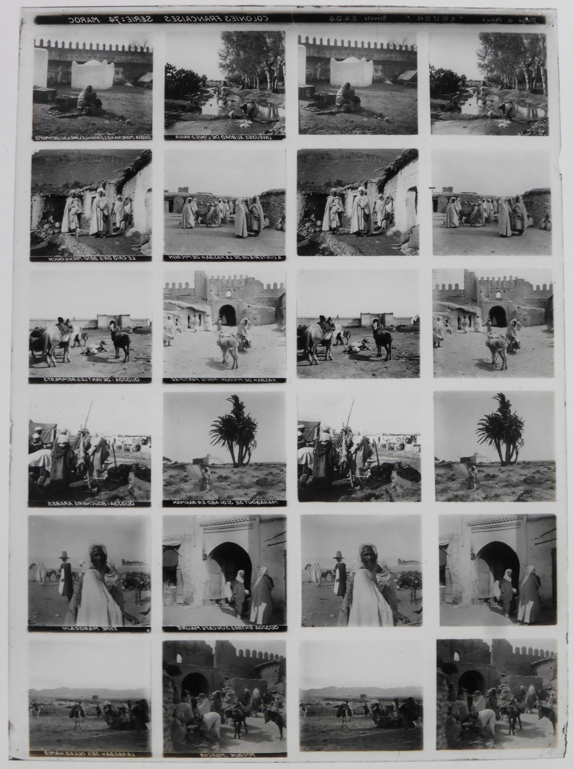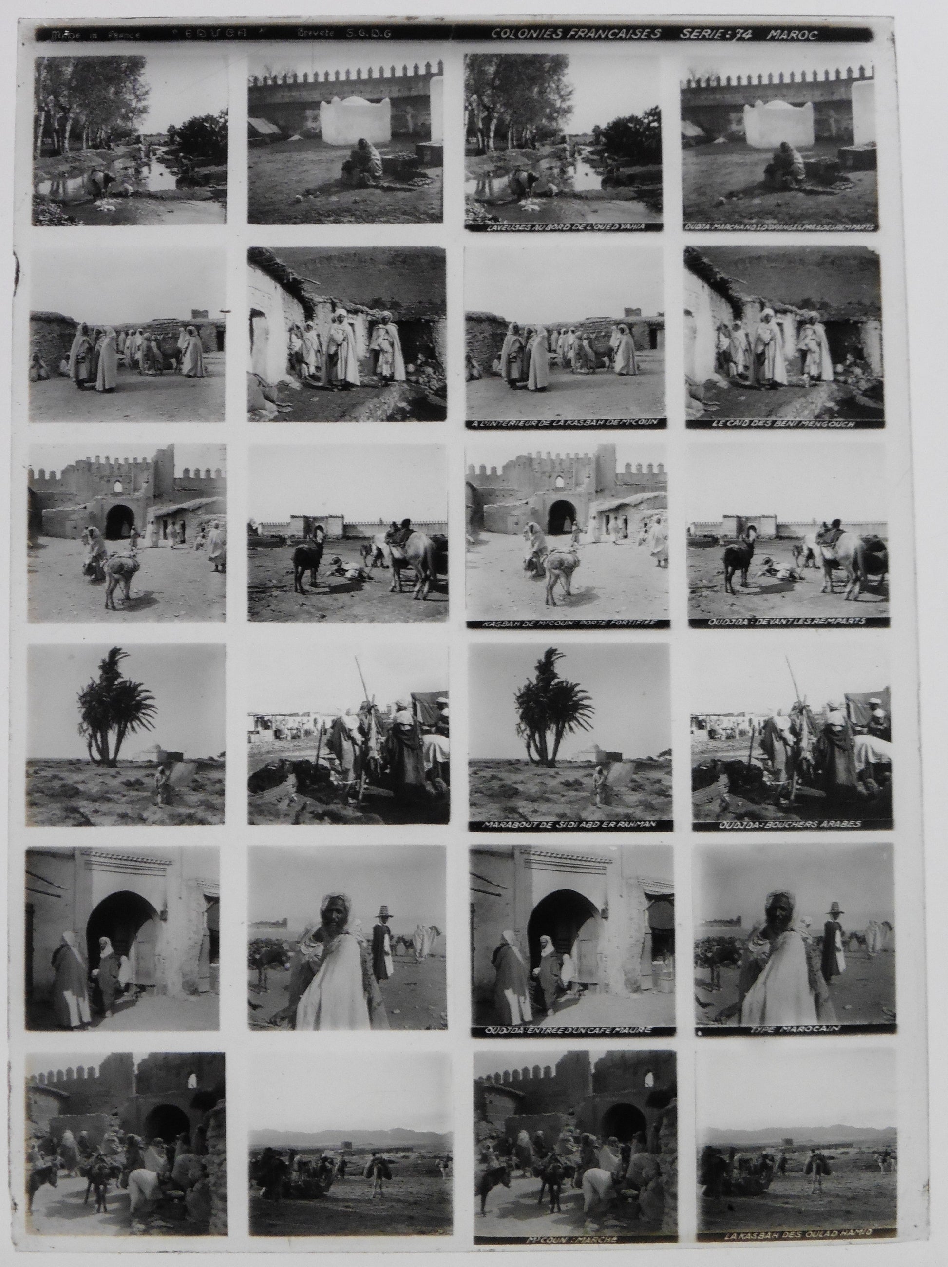 Educa.Colonnies Françaises. Série 74 "Maroc" Stereo 12 Vues sur plaque de verre positive 13x18 pour borne stéréoscopique Educa."